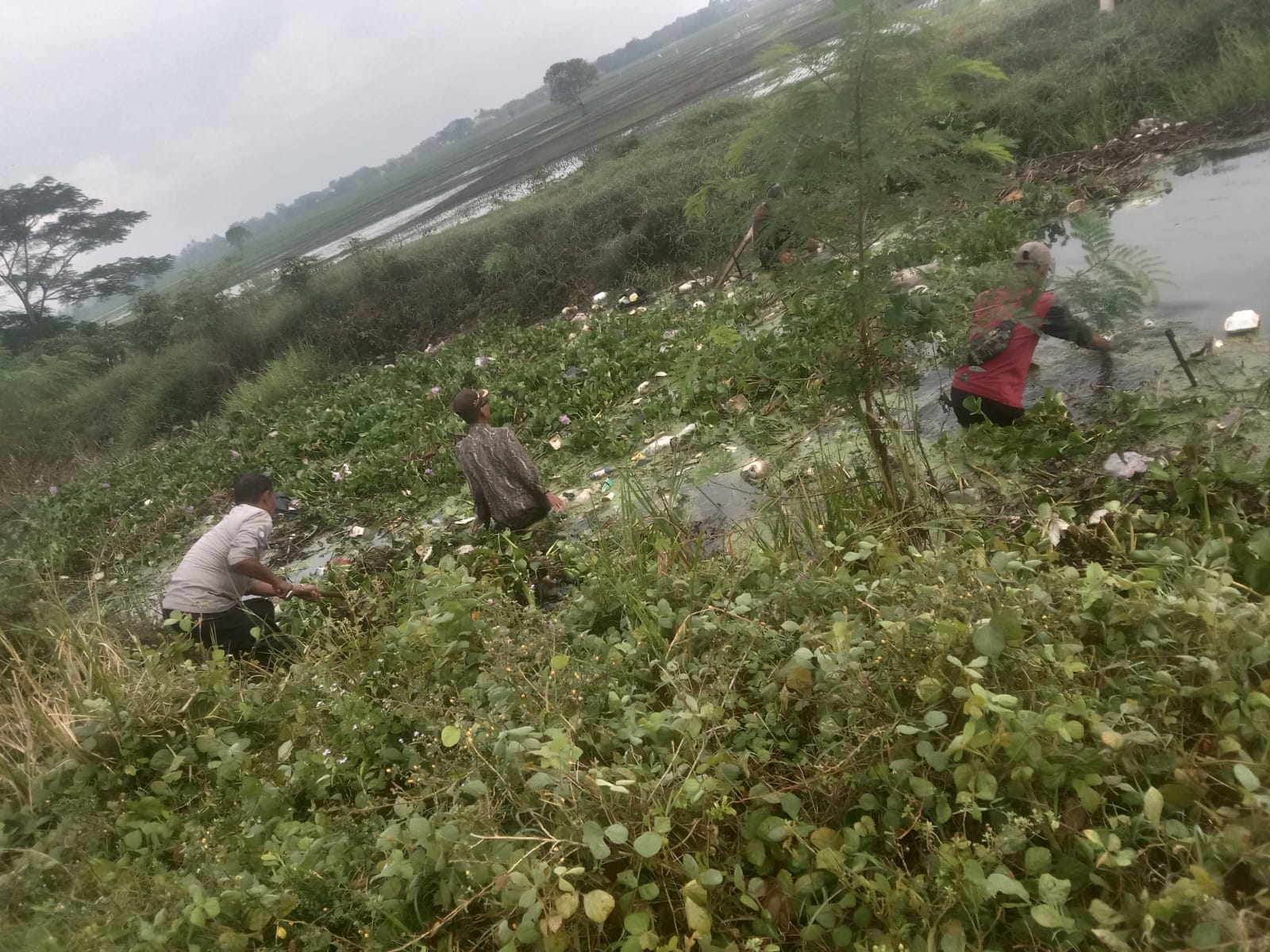 Bhabinkamtibmas Polsek Pebayuran bersama Warga Desa Karang Harja Gotong Royong Bersihkan Enceng Gondok Yang Menyumbat Aliran Irigasi