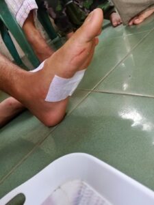 Akibat kejadian tersebut, korban mengalami luka robek serius pada telapak kaki sebelah kiri dan sempat mengeluarkan darah cukup banyak.