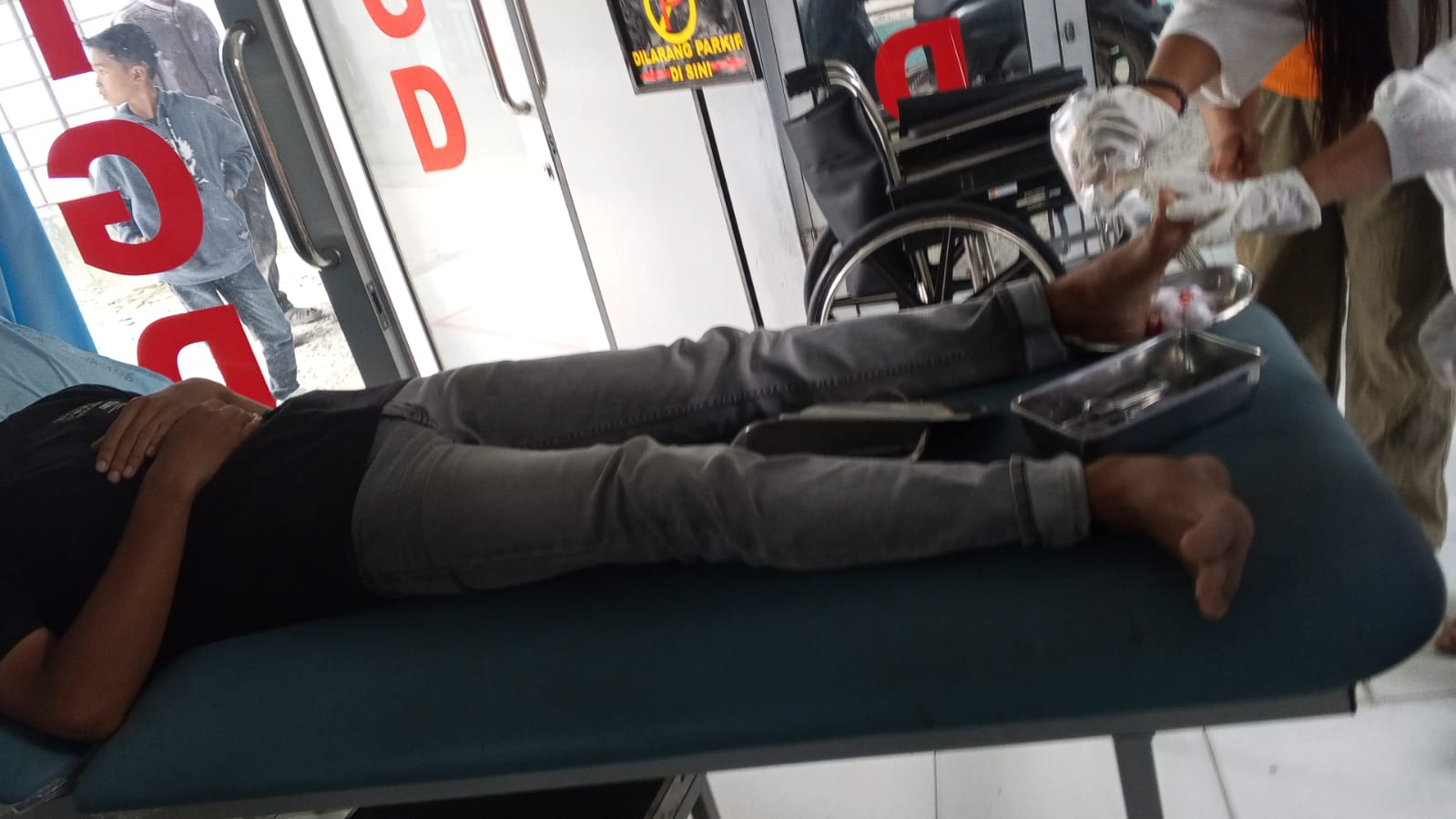 Akibat kejadian tersebut, korban mengalami luka robek serius pada telapak kaki sebelah kiri dan sempat mengeluarkan darah cukup banyak.