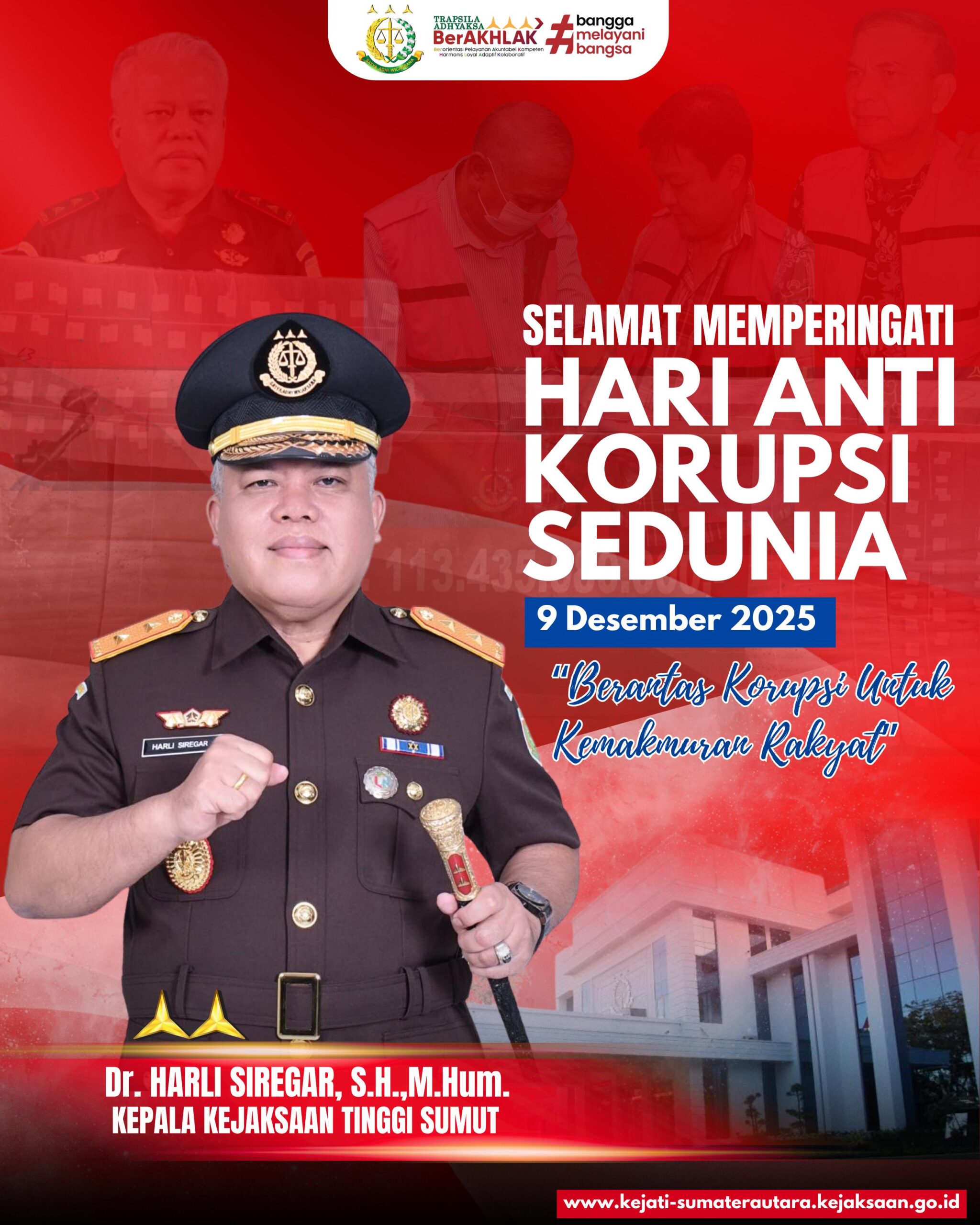 MEDAN,Radar BI – Kajati Sumatera Utara Dr.Harli Siregar, SH.,M.Hum memimpin upacara peringatan hari anti korupsi sedunia (HAKORDIA) Kejaksaan Tinggi Sumatera Utara tahun 2025 yang dilaksanakan di Adhyaksa Hall lantai I Kejati Sumatera Utara hari Selasa 9 Desember 2025 dengan mengusung tema *” BERANTAS KORUPSI UNTUK KEMAKMURAN RAKYAT”.