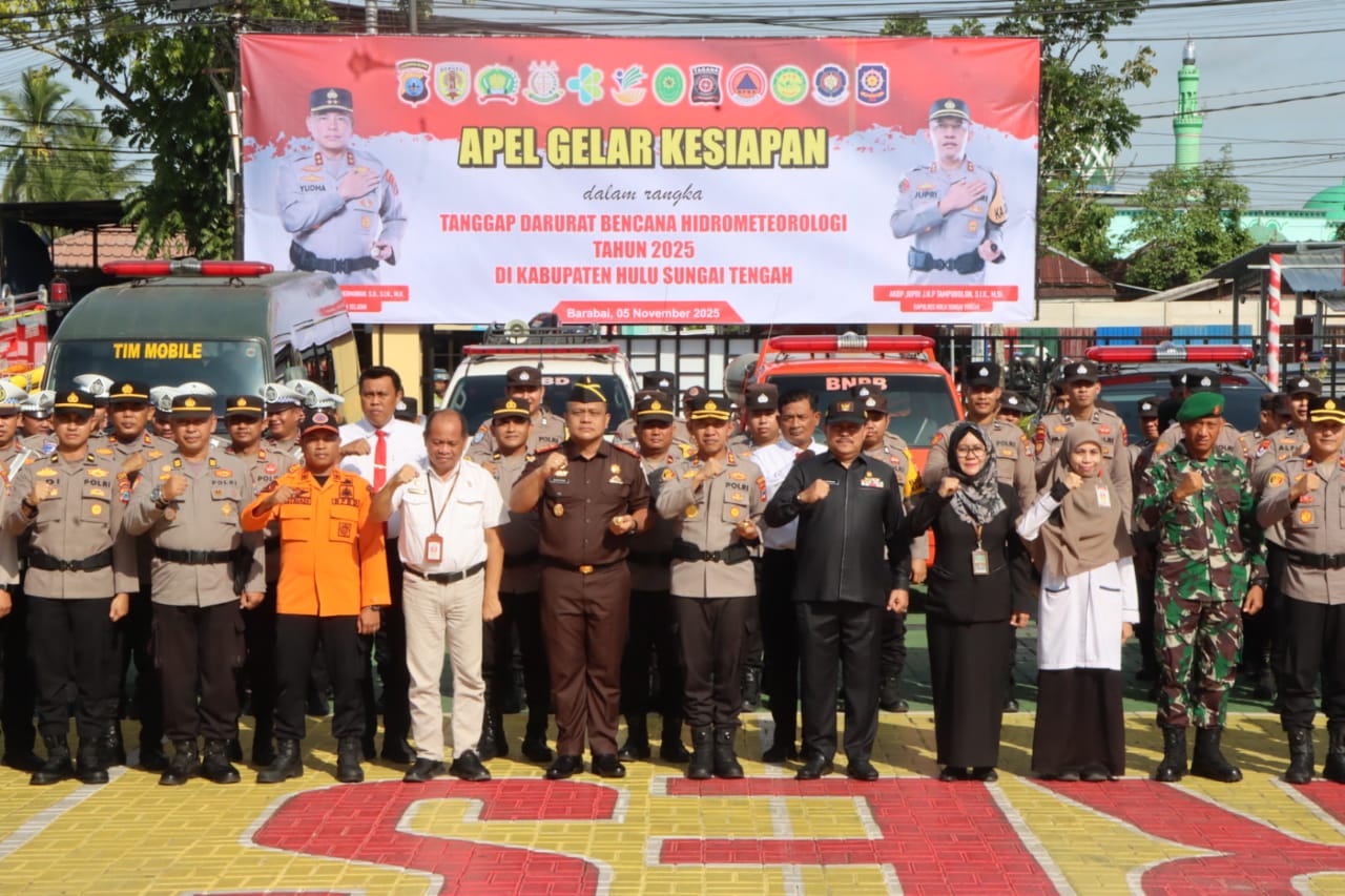 KALIMANTAN SELATAN, Radar BI-Polres Hulu Sungai Tengah Polda Kalimantan Selatan.Dalam rangka kesiapsiagaan menghadapi potensi bencana hidrometeorologi yang dapat terjadi akibat perubahan cuaca ekstrem, Kapolres HST AKBP Jupri JHP Tampubolon, S.I.K., M.Si memimpin langsung Apel Gelar Pasukan Kesiapan Tanggap Darurat Bencana Hydrometeorologi yang dilaksanakan di Lapangan Apel Mako Polres HST , Selasa (04/11/2025).