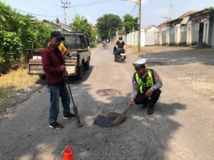 Satlantas Polsek Rogojampi Bersama Pemerintah Desa,Lakukan Penambalan Jalan Rusak Berlubang di Desa Gladag