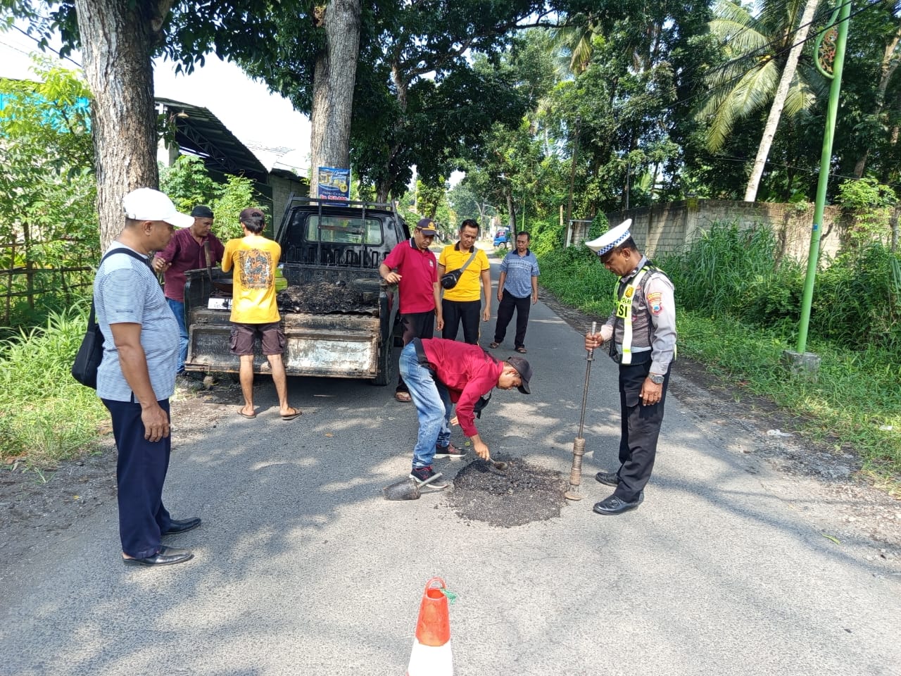 Satlantas Polsek Rogojampi Bersama Pemerintah Desa,Lakukan Penambalan Jalan Rusak Berlubang di Desa Gladag