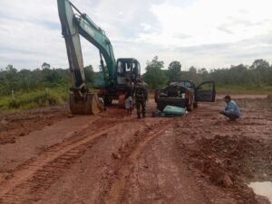 Progres pengerjaan perintisan jalan terus menunjukkan kemajuan yang signifikan, di mana para anggota Satgas TMMD bahu-membahu bersama alat berat yang dikerahkan, tak kenal lelah meratakan tanah dan membuka jalan yang akan menjadi urat nadi perekonomian kampung ini.