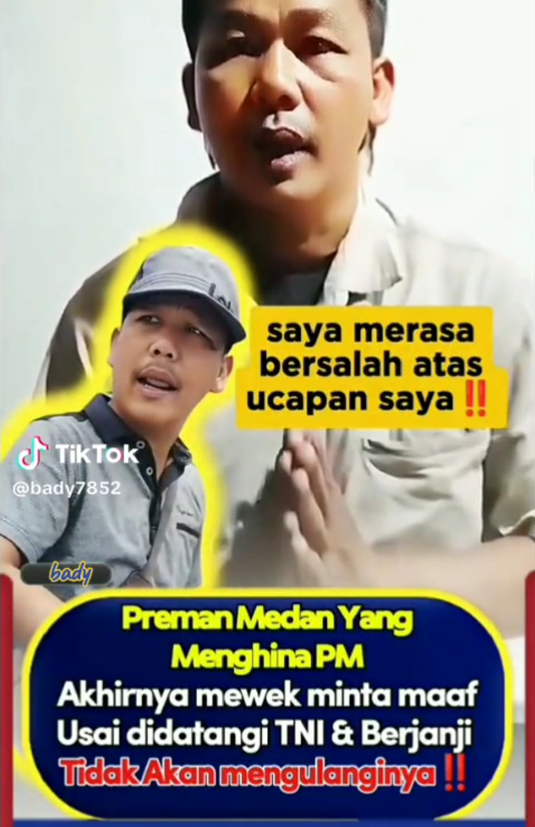 “Selanjutnya beberapa hari kemudian saya dijemput lagi oleh beberapa orang Petugas ,yang diduga Anggota Denpom guna mengklarifikasi terkait Unggahan Video tersebut juga,tapi memang saya tidak ada niat ataupun menjelekkan Institusi TNI ataupun PM makanya saya disuruh buat Video klarifikasi permintaan maaf terkait Video tersebut, selanjutnya saya disuruh pulang,”ungkapnya.